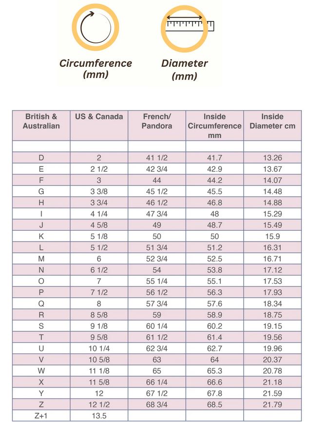 Compare your Circumference measurement to the ring size chart below to find your corresponding size.