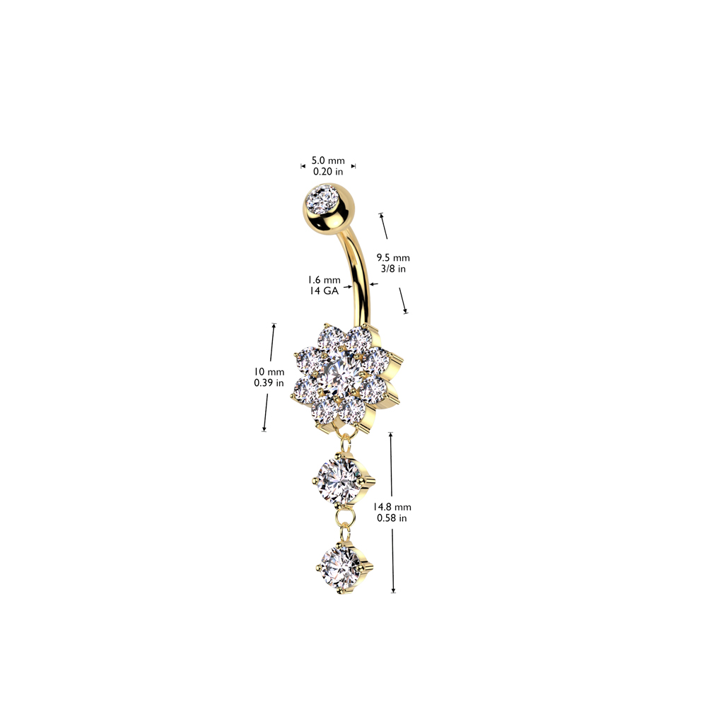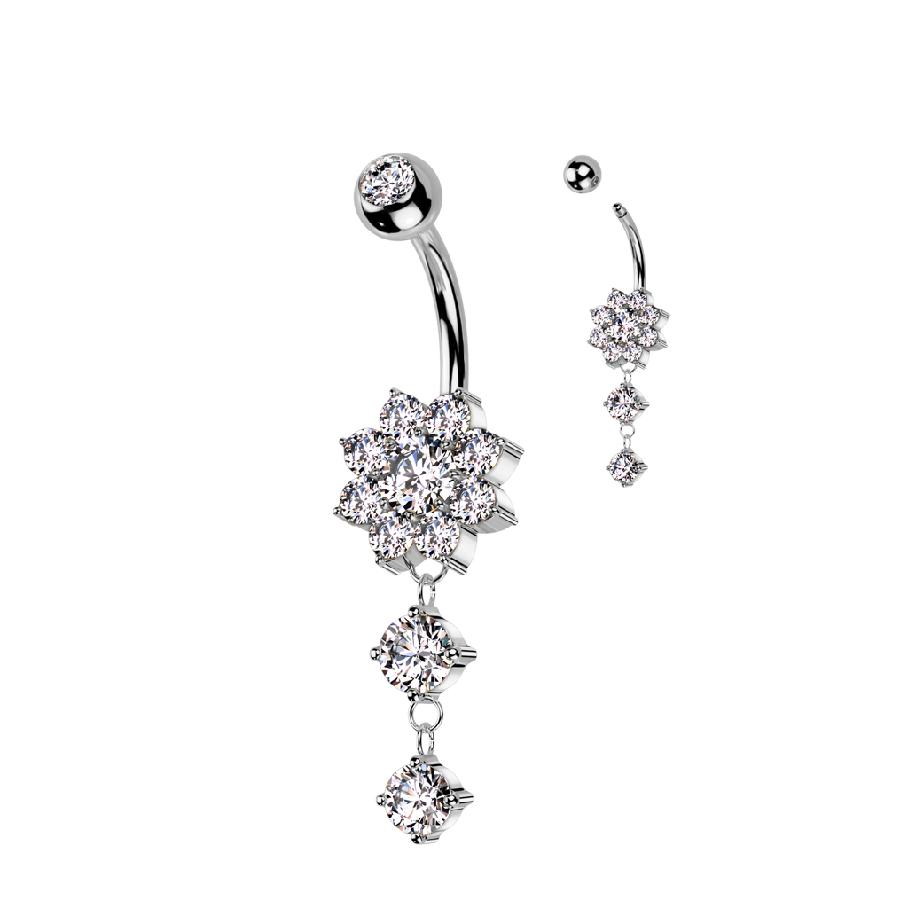 • The Belly Bar with a Clear CZ Flower and Dangles is manufactured from Surgical Stainless Steel so will not rust, corrode or stain.