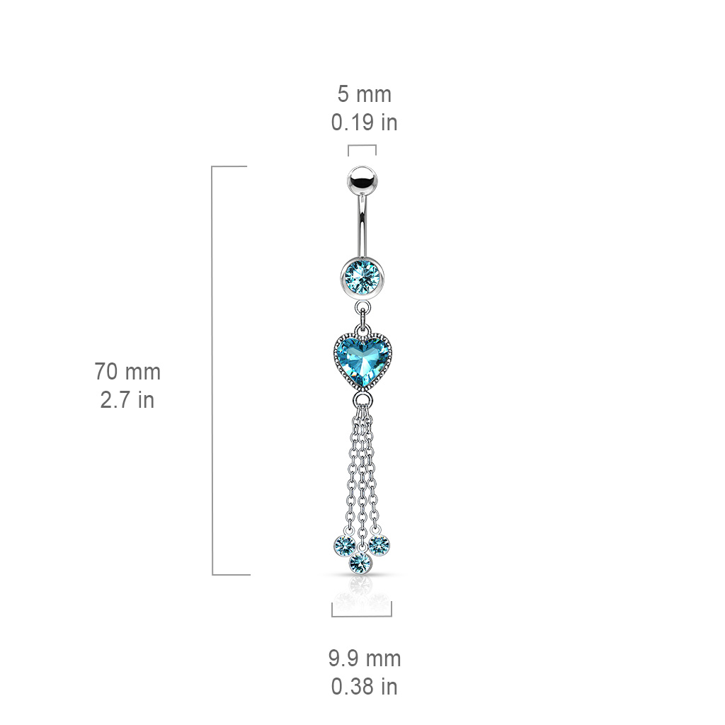 This Belly Bar with an Aqua Heart and Dangles is manufactured from Surgical Stainless Steel so will not rust, corrode or stain.