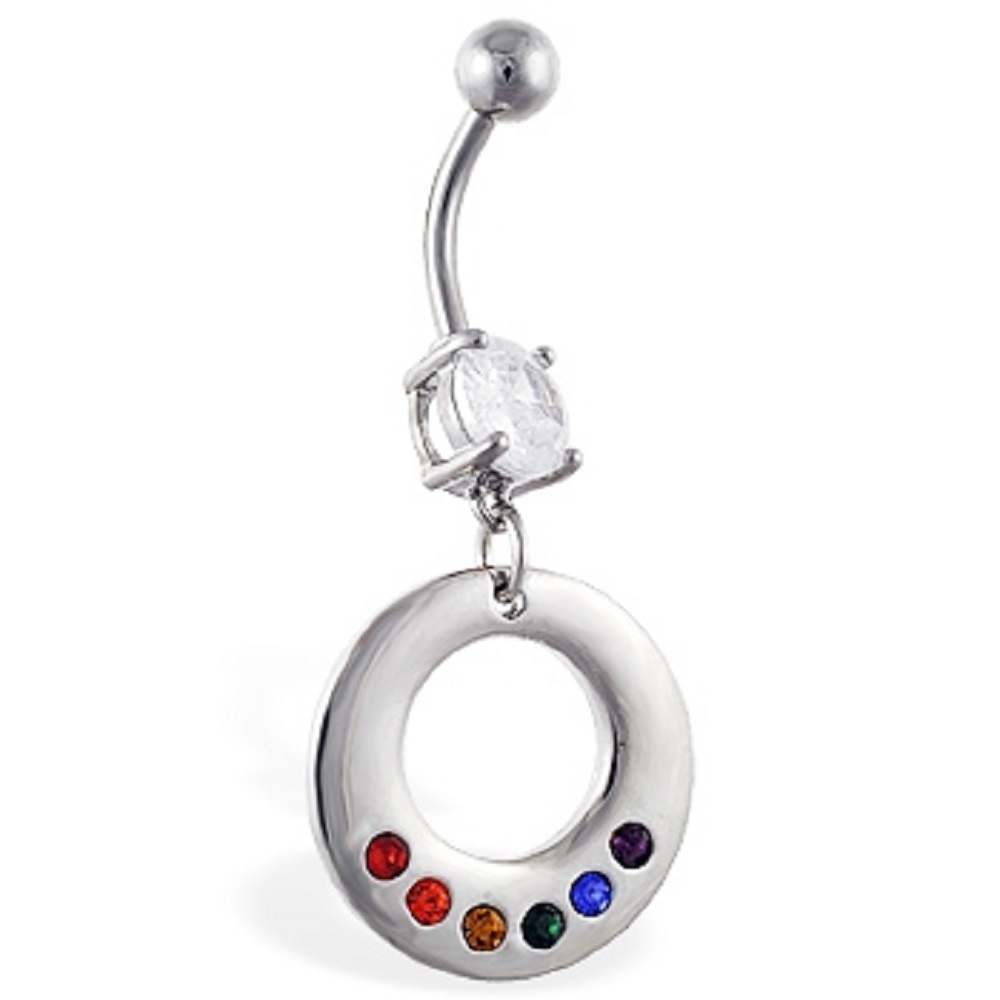 Belly Bar with Dangling Ring and Rainbow CZ Gems