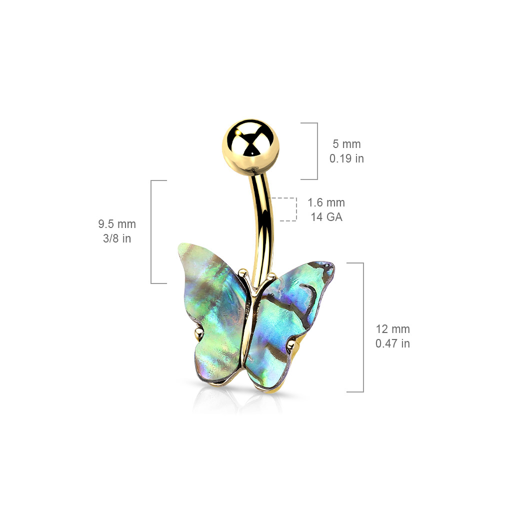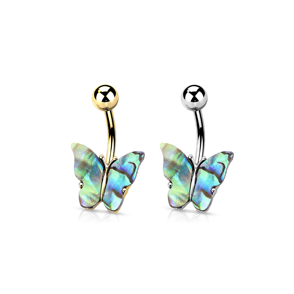 The Belly Bar with Shell Covered Butterfly is manufactured from Surgical Stainless Steel so will not rust, corrode or stain.