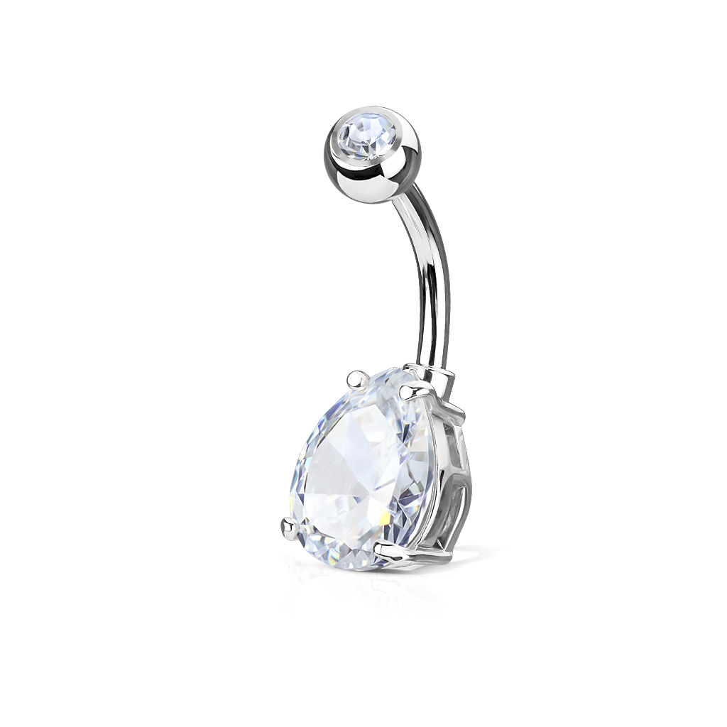 this Belly Bar with Solitaire Teardrop is manufactured from Surgical Stainless Steel so will not rust, corrode or stain. This jewellery is best for healed piercings. Surgical Stainless Steel contains traces of nickel so may not be suitable for those with a nickel allergies. The tear drop is manufactured with rhodium plated brass