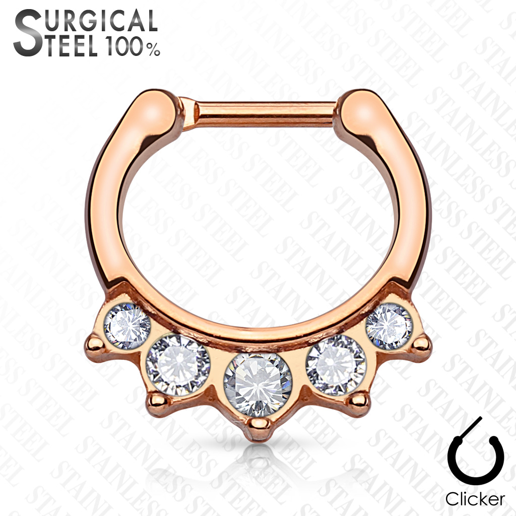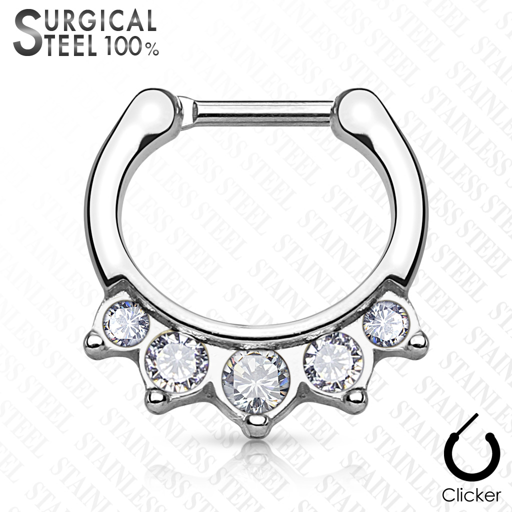 • This Clicker with 5 Clear CZ Gems Hanger is manufactured from Surgical Stainless Steel so will not rust, corrode or stain. The casing for the CZ gems contains brass and rhodium. This jewellery is best for healed piercings. Surgical Stainless Steel contains traces of nickel so may not be suitable for those with a nickel allergies