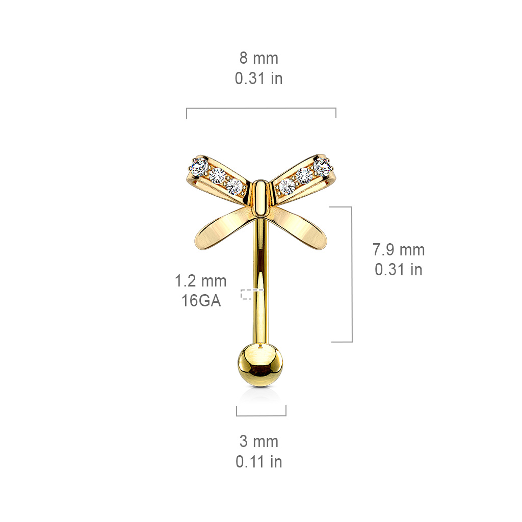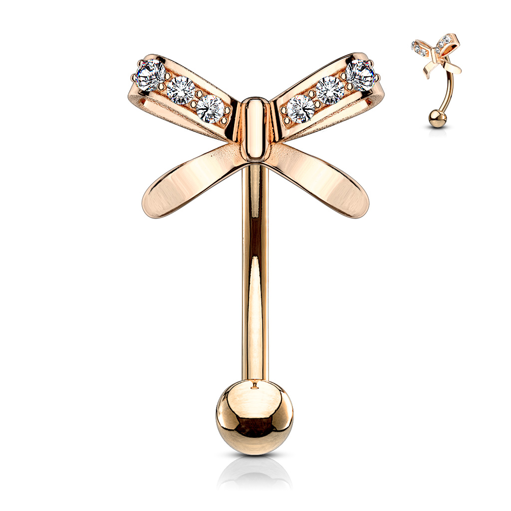 About this Curved Barbell with a Bow and Clear CZ Gems