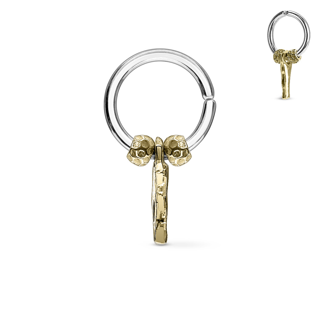 The Cut Ring with Small Gold Sliders and Dangle is manufactured from Surgical Stainless Steel so will not rust, corrode or stain.
