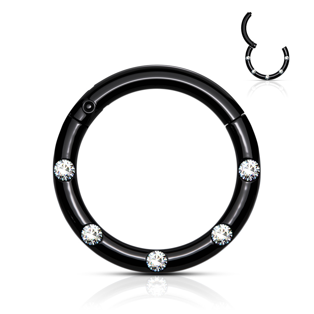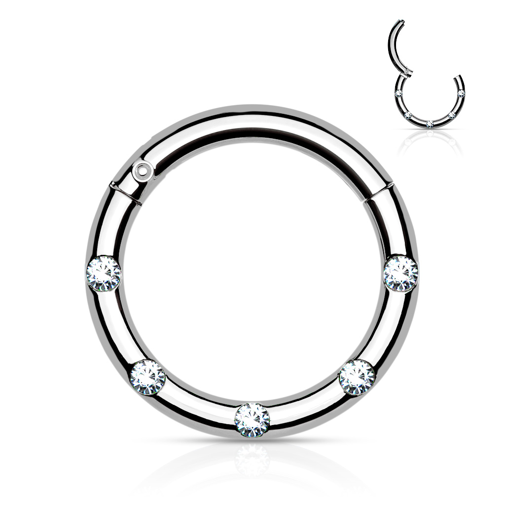 • The Hinged Ring with 5 Flush Set Front Facing Clear Petite Crystals is manufactured from Surgical Stainless Steel so will not rust, corrode or stain. Surgical Steel jewellery is best for healed piercings but as it contains traces of nickel it may not be suitable for those with a nickel allergies