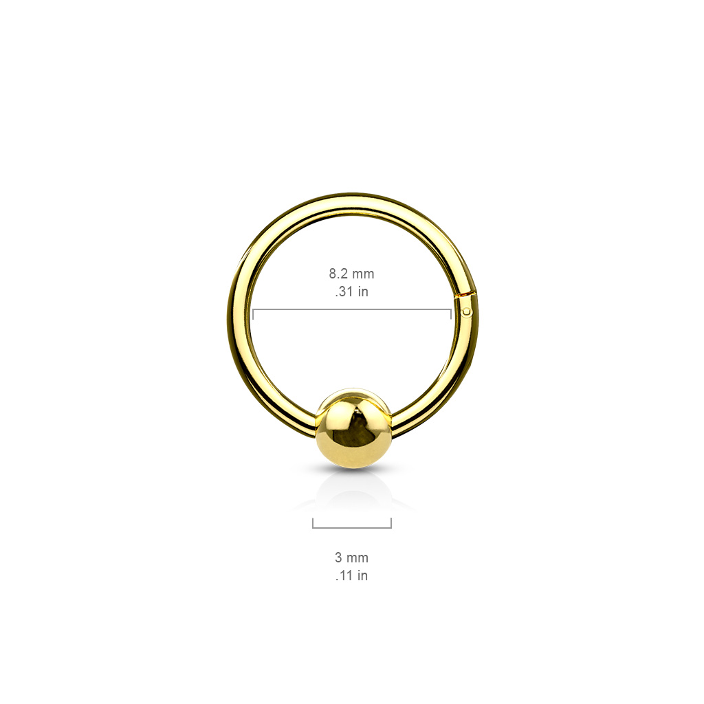 • The ring is hinged and clicks closed to form a sealed ring. It has a ball that is fixed to the ring and gives the look of a BCR without needing to struggle getting the ball to line up