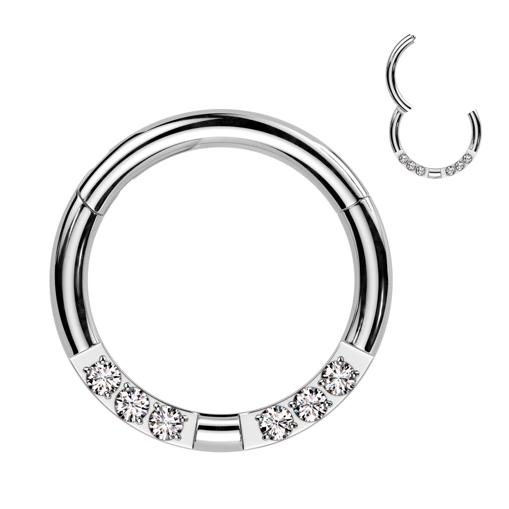 • The ring is hinged and clicks closed to form a sealed ring. The Hinged Ring with Forward Facing Clear CZ Gems is manufactured from Surgical Stainless Steel so will not rust, corrode or stain. Surgical Steel jewellery is best for healed piercings but as it contains traces of nickel it may not be suitable for those with a nickel allergies