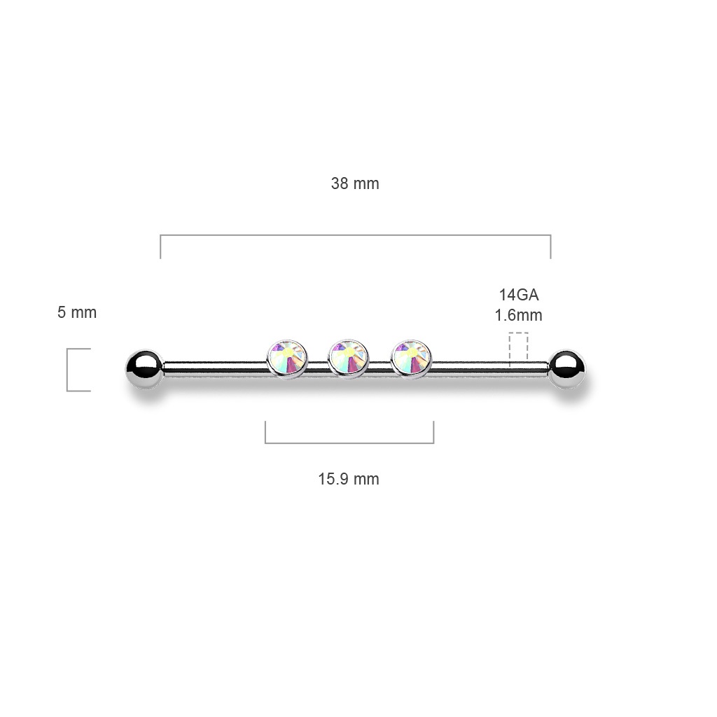 • The gems are 4mm and are internally threaded so you could change out the fittings with your own 1.2mm internally threaded jewellery. As this bar is 38mm it is not suitable for anyone who has been pierced with shorter bars in their industrial