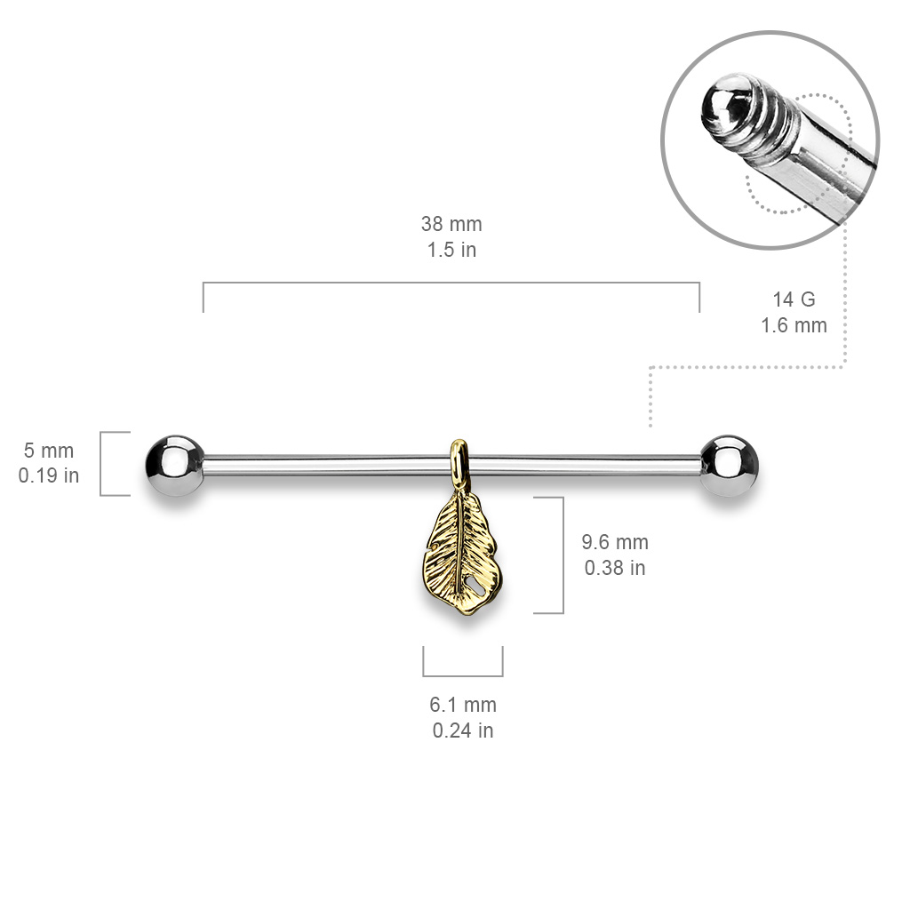 • This Industrial Bar with Leaf Dangle is manufactured from Surgical Stainless Steel so will not rust, corrode or stain. The leaf casing contains brass and rhodium. This jewellery is best for healed piercings. Surgical Stainless Steel contains traces of nickel so may not be suitable for those with a nickel allergies