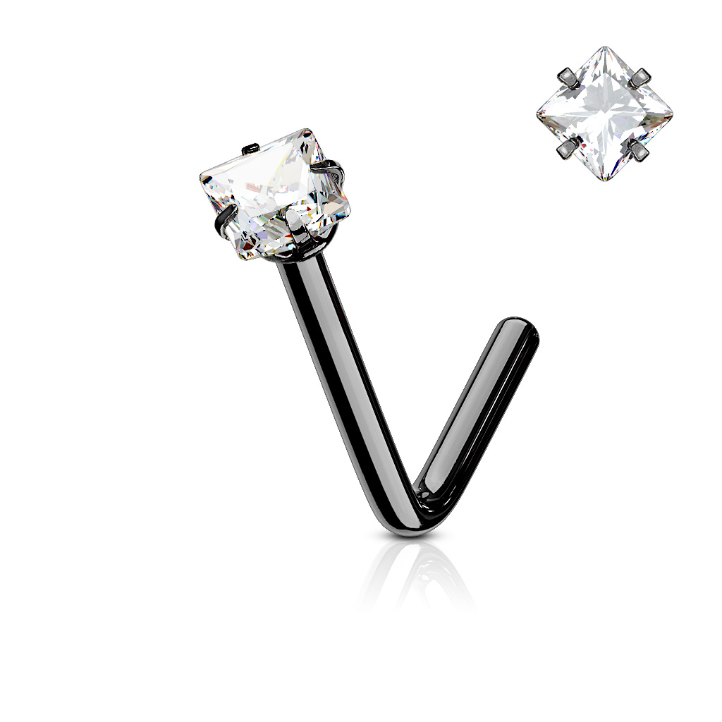 The L-Bend Nose Stud with a Clear Square CZ Centre is manufactured from surgical stainless steel so will not rust, corrode or stain. This jewellery is best for healed piercings. Surgical stainless steel contains traces of nickel so may not be suitable for those with a nickel allergies