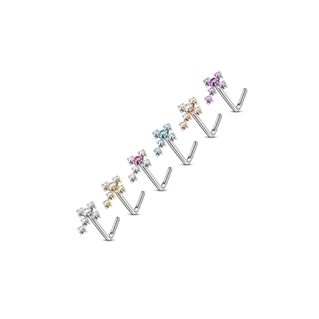 • The L-Bend Nose Stud with a CZ Cross is manufactured from surgical stainless steel so will not rust, corrode or stain. The frame for the cross contains brass and rhodium. This jewellery is best for healed piercings. Surgical stainless steel contains traces of nickel so may not be suitable for those with a nickel allergies