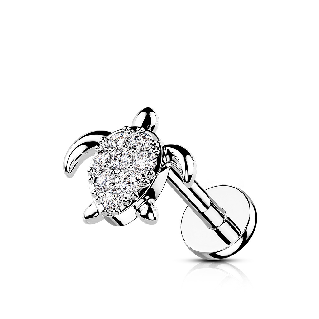 This Labret with a Clear Gem Turtle is manufactured from Surgical Stainless Steel so will not rust, corrode or stain.