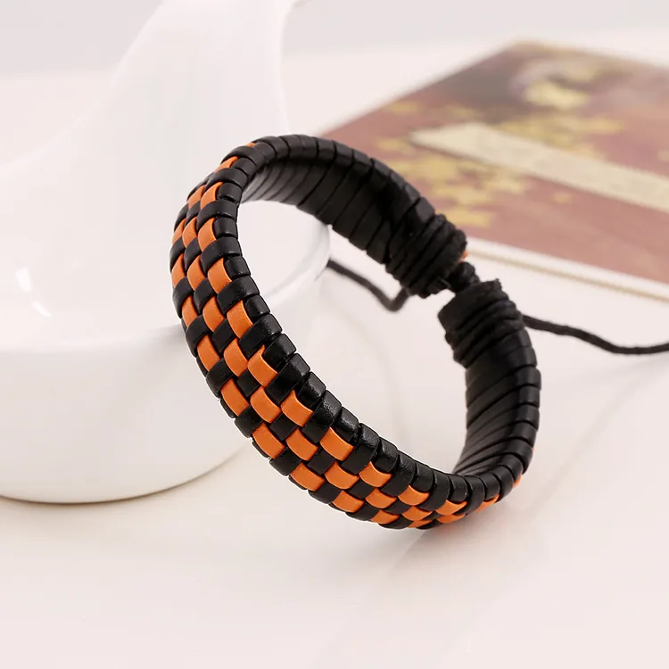 Leather Drawstring Bracelet with Orange and Black Pattern