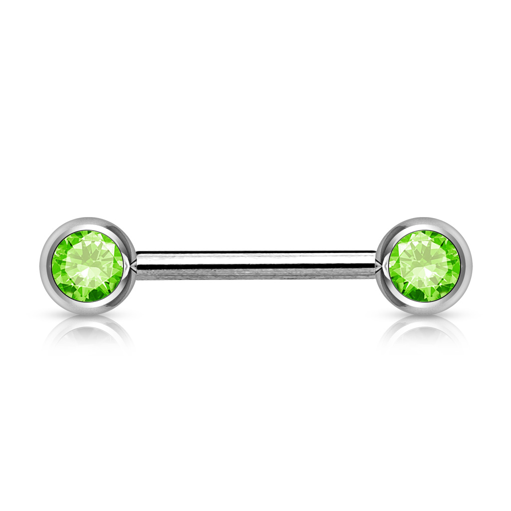 About this Nipple Bar with Front Facing Green CZ Gem Balls