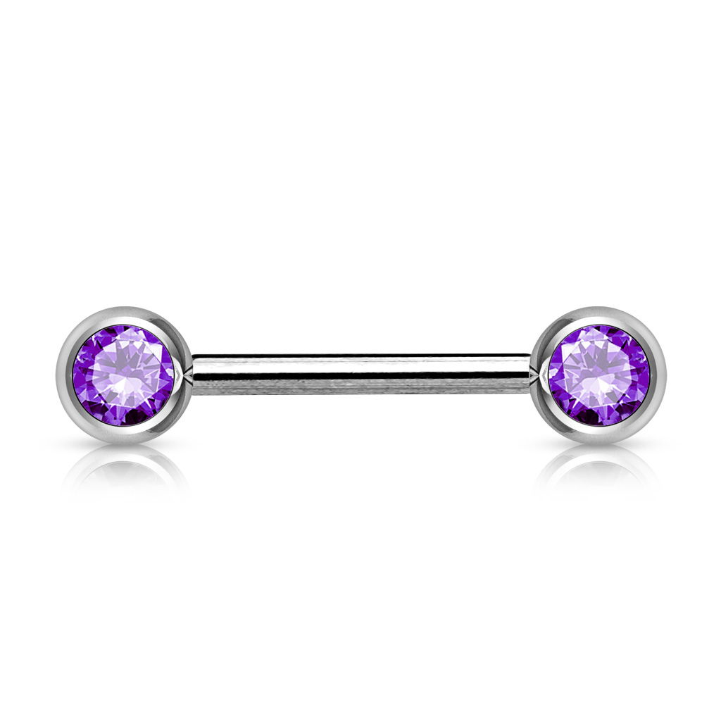 About this Nipple Bar with Front Facing Tanzanite CZ Gem Balls