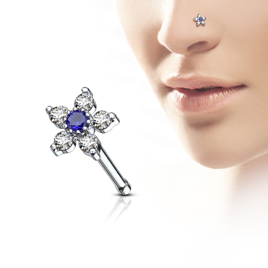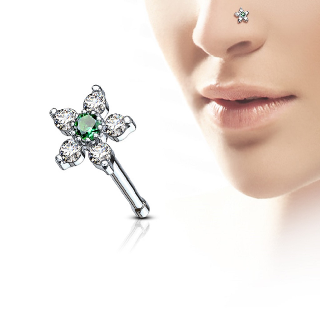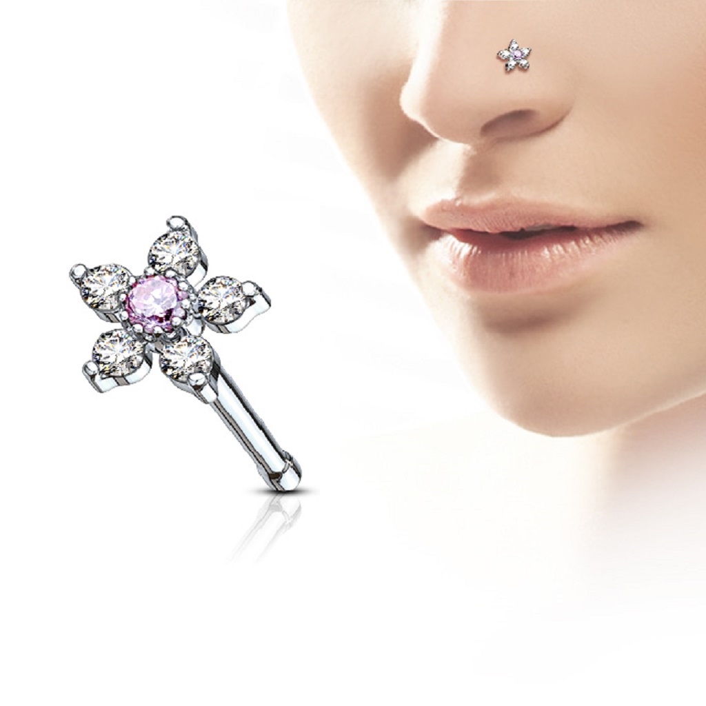 • The Nose Stud with a CZ Flower Head is manufactured from Surgical Stainless Steel so will not rust, corrode or stain. The flower head is rhodium pated brass. Surgical Steel jewellery is best for healed piercings but as it contains traces of nickel it may not be suitable for those with a nickel allergies