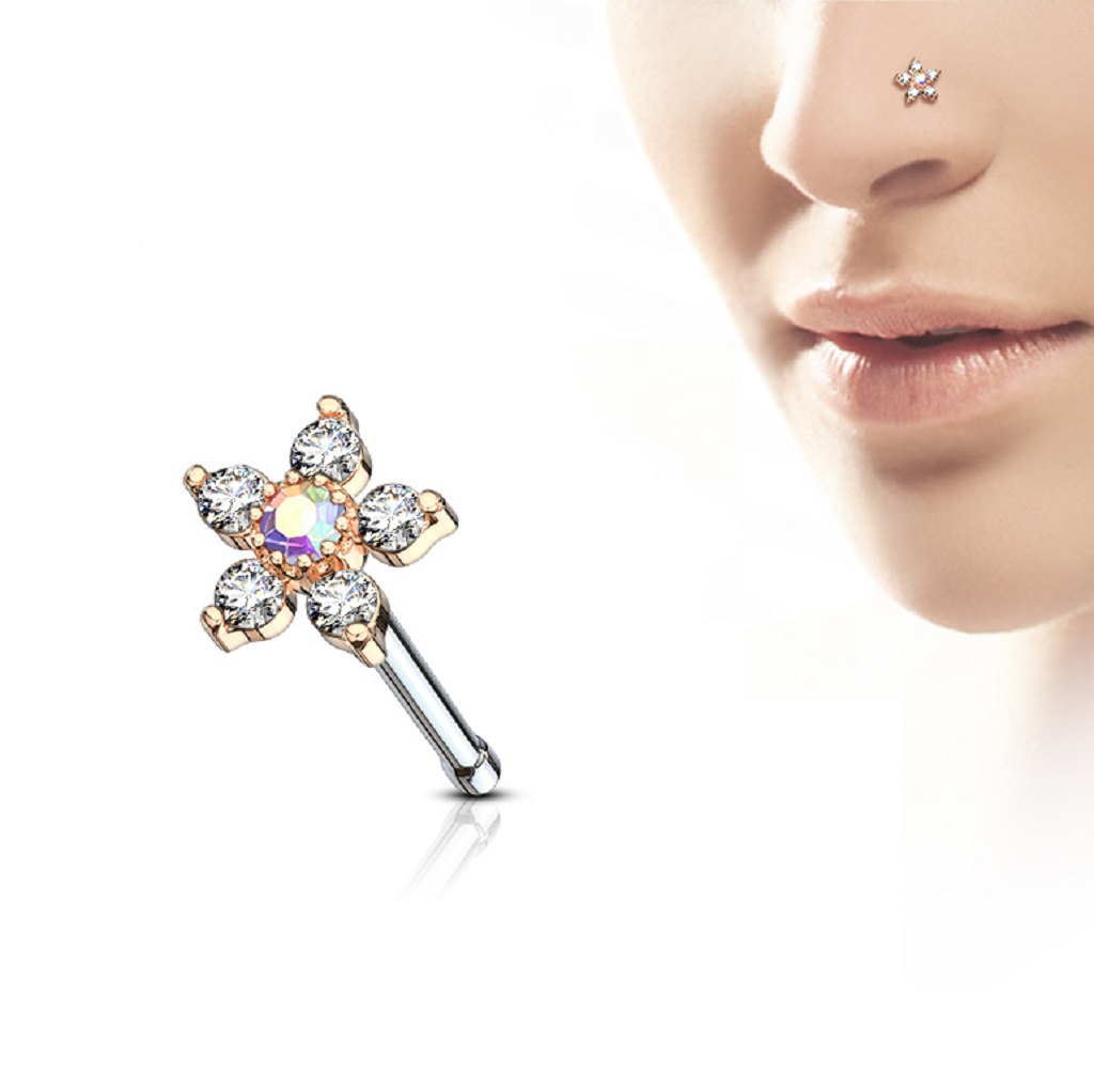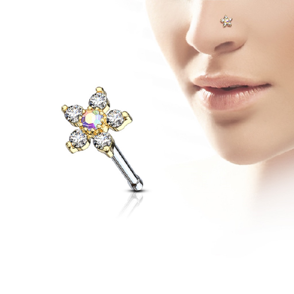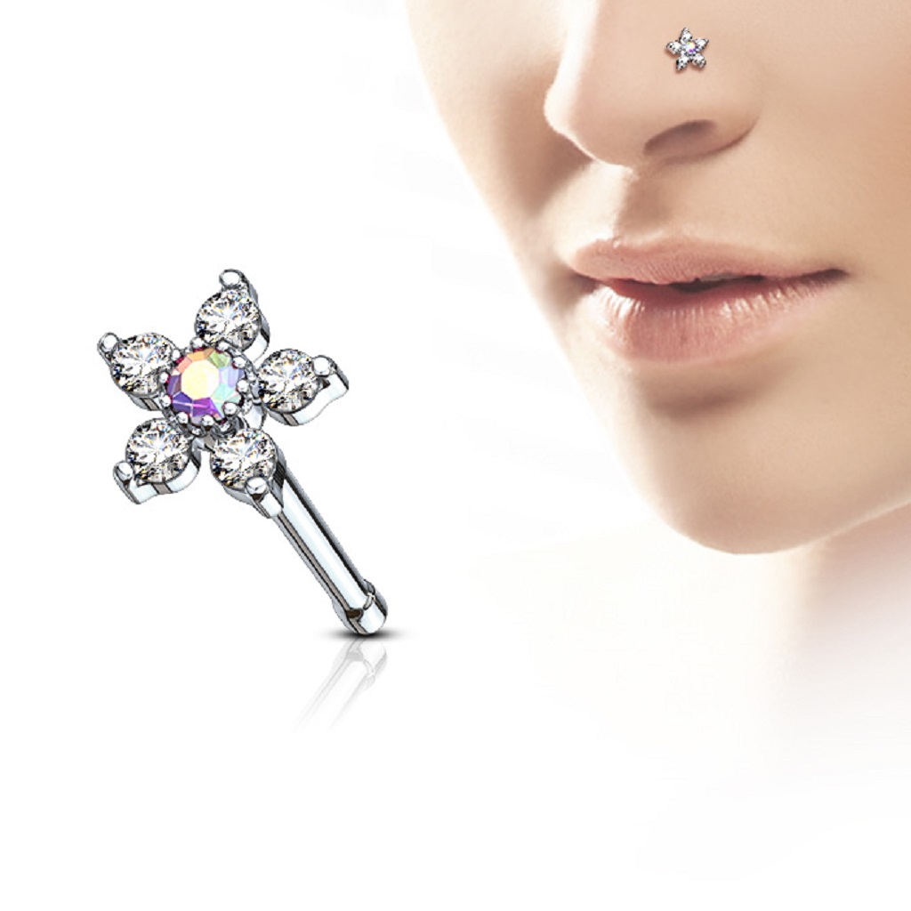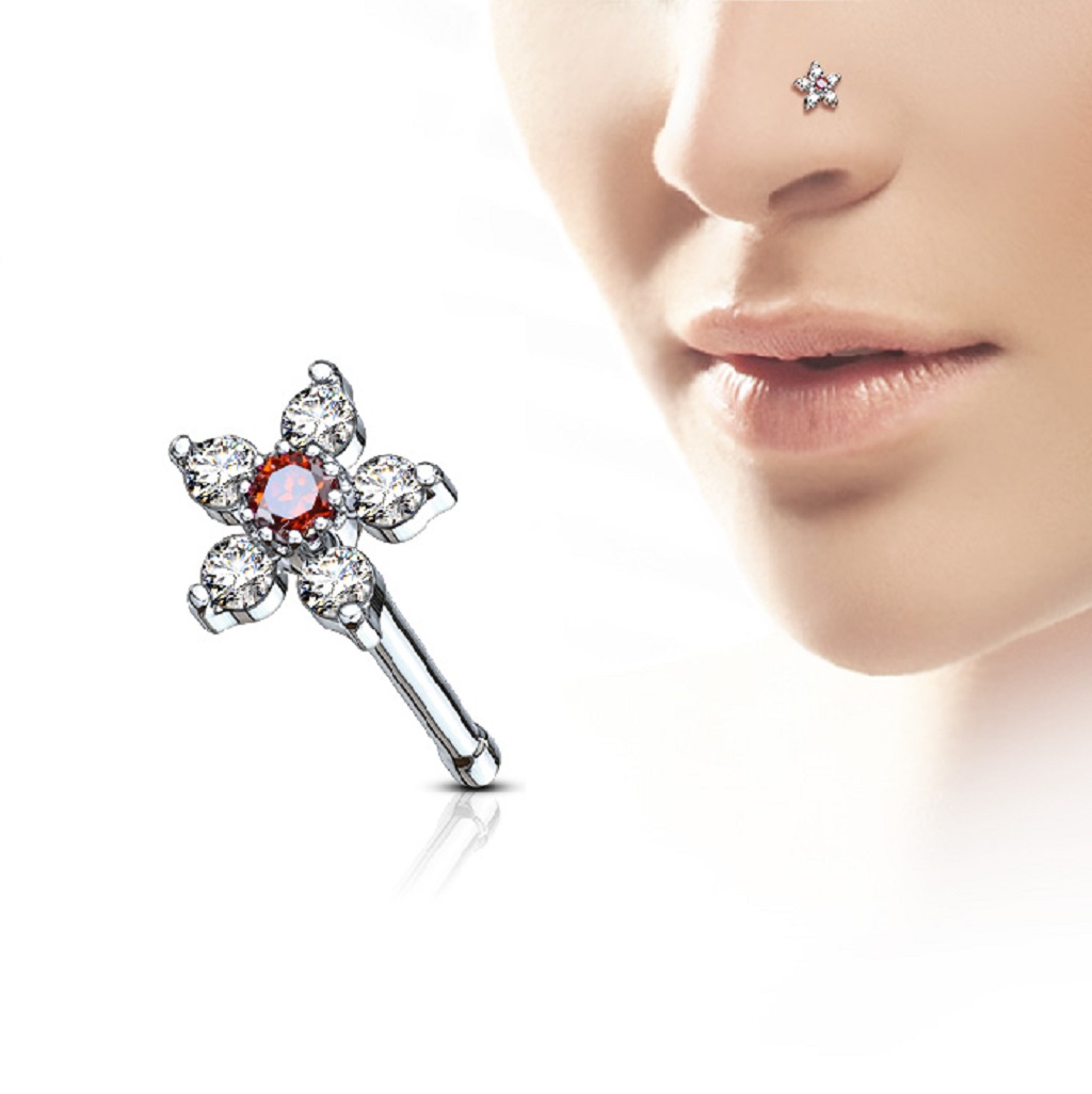 • The Nose Stud with a CZ Flower Head is manufactured from Surgical Stainless Steel so will not rust, corrode or stain. The flower head is rhodium pated brass. Surgical Steel jewellery is best for healed piercings but as it contains traces of nickel it may not be suitable for those with a nickel allergies