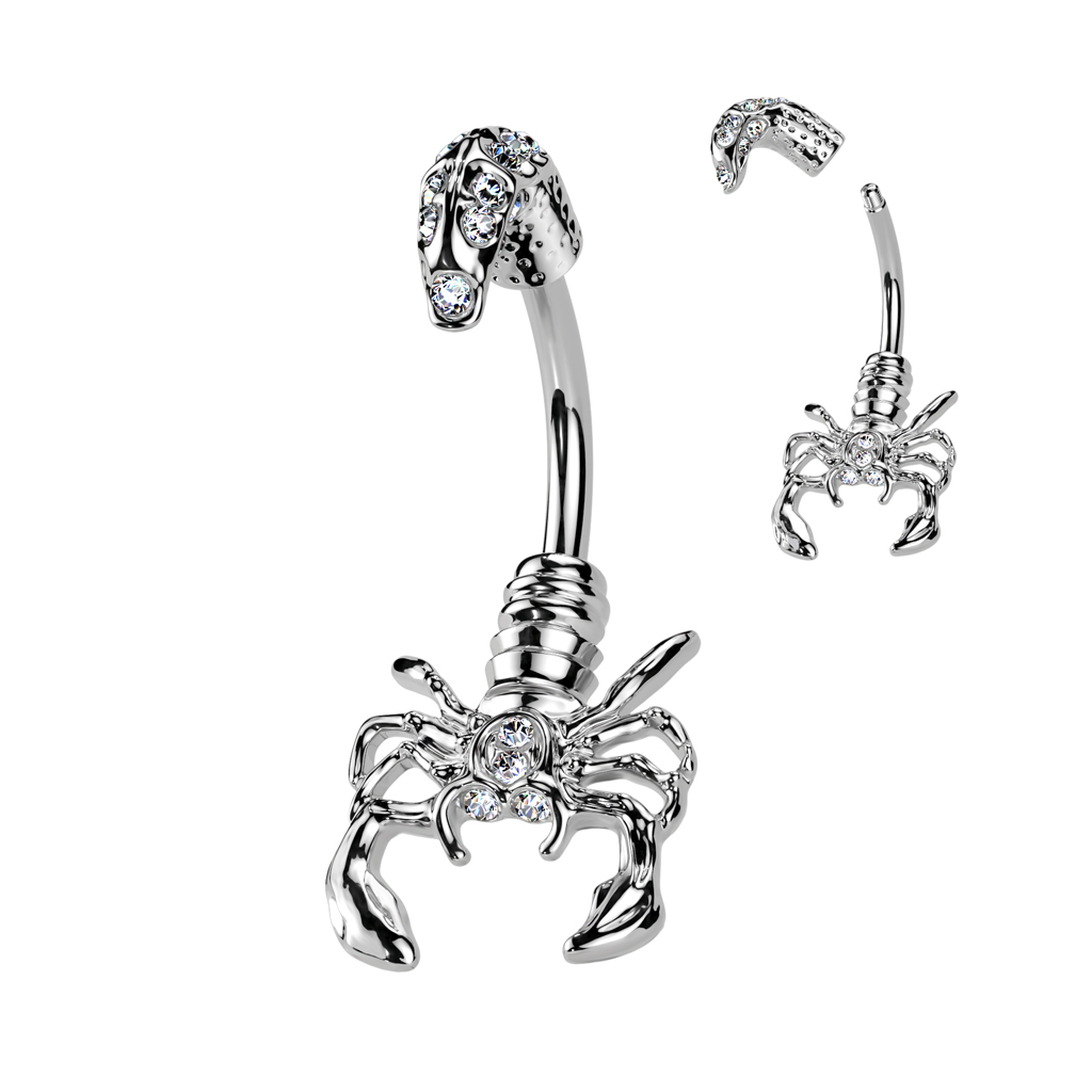 • The top “ball” is a striking tail shape featuring multiple cz gems. The bar is externally threaded. The bottom scorpion body does not unscrew and is permanently attached. It also features multiple cz gems and is 12mm wide and 15mm in length