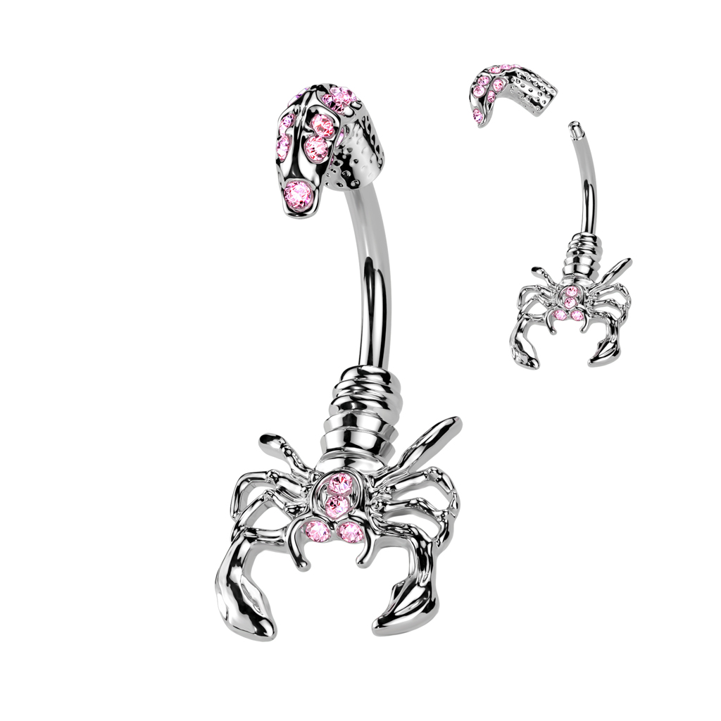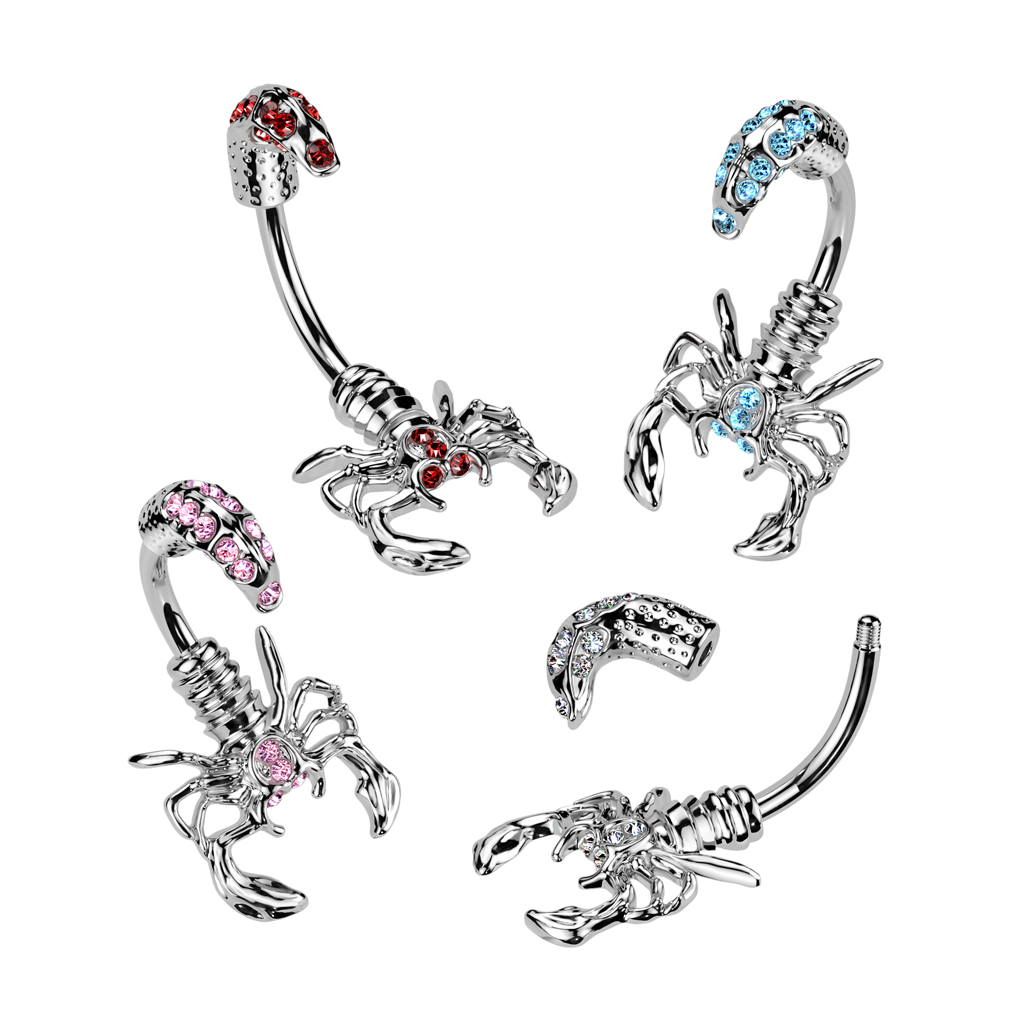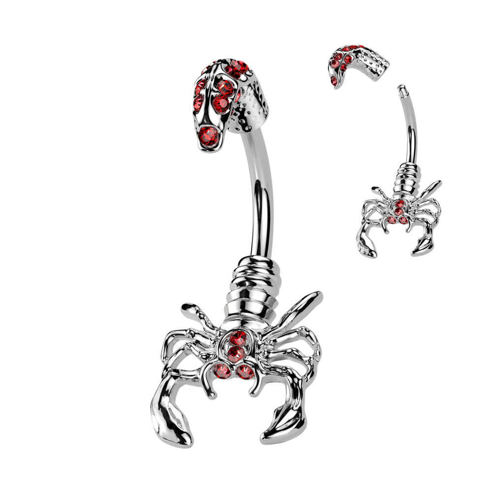 • The Scorpion Belly Bar with Multiple CZ Gems in its Head and Tail is manufactured from Surgical Stainless Steel so will not rust, corrode or stain. The casing for the scorpion body and sting contain brass and rhodium. Surgical Steel jewellery is best for healed piercings but as it contains traces of nickel it may not be suitable for those with a nickel allergies