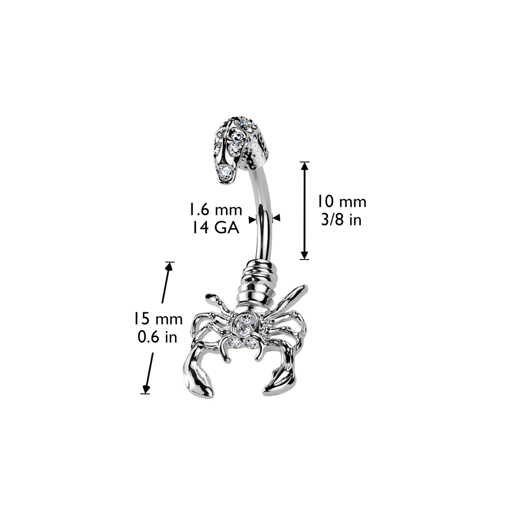• The Scorpion Belly Bar with Multiple CZ Gems in its Head and Tail is manufactured from Surgical Stainless Steel so will not rust, corrode or stain.